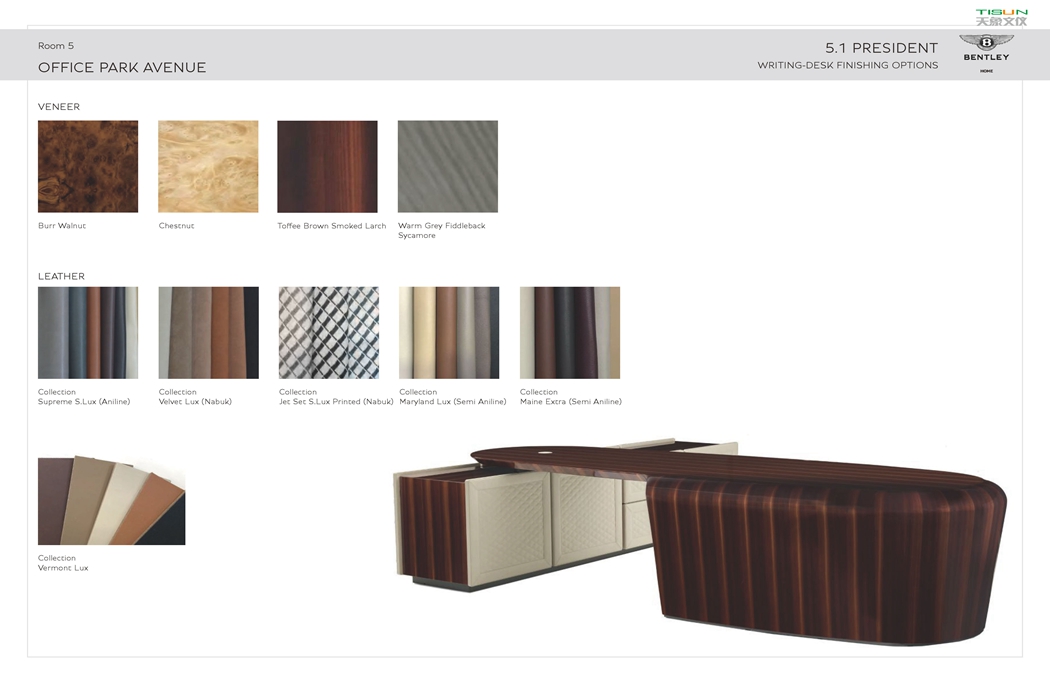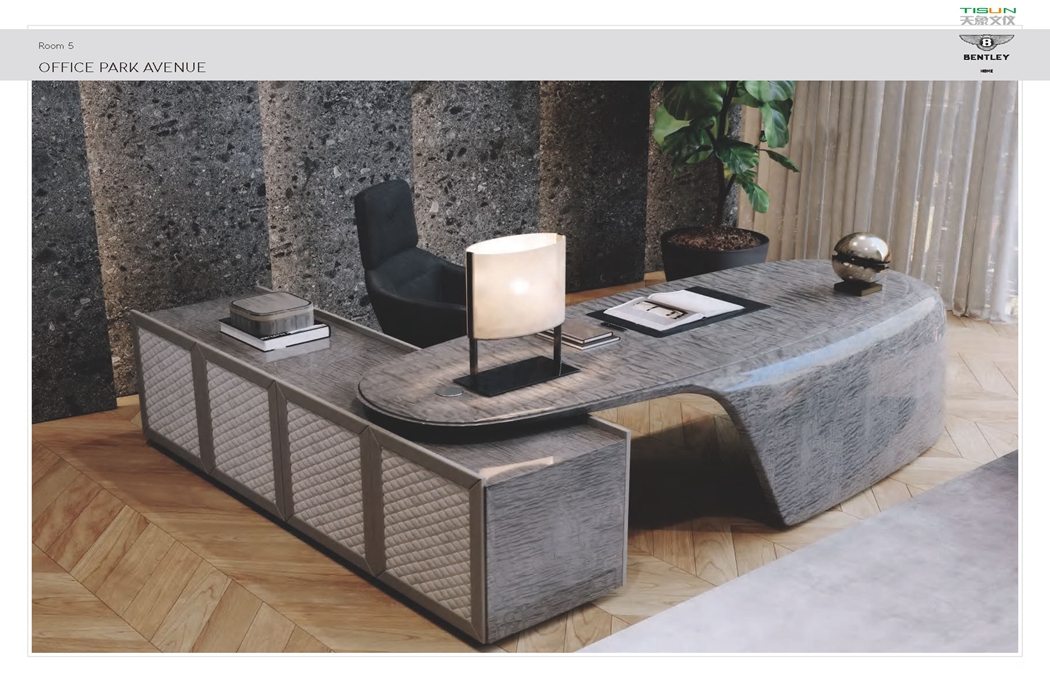 此款辦公家具-匠心獨到的設計,氣派非凡,大班本色,表露無遺,精選皮料,手工精細,完美無瑕。班臺面轉折面線條流暢,每一處設計都與整個環境相融合,處處體現定制辦公家具廠計師設身處地為使用者著想的用戶思維方式。