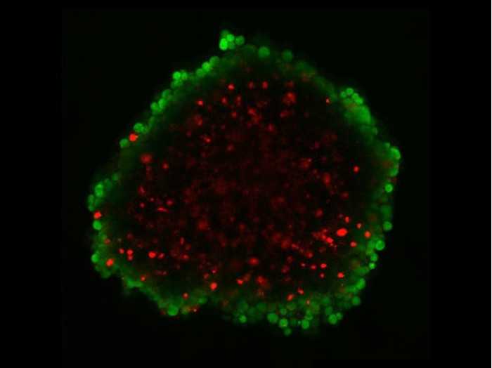 HepG2 球體的共聚焦激光掃描部分。 HepG2 細胞球體使用基于瓊脂糖的液體覆蓋技術(shù)生成,并轉(zhuǎn)移到 µ-Dish 35 mm、高壁生物惰性培養(yǎng)皿。 FDA(綠色)表示外球體層的活細胞。 PI(紅色)標記壞死球體中心內(nèi)的死細胞。 顯微鏡:蔡司 LSM 710,平面復消色差物鏡 10x/0.45。 比例尺為 200 µm。